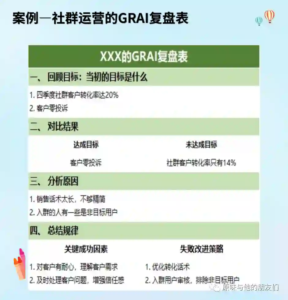 从GRAI四个维度进行复盘,在社群运营的过程中,复盘表可有规律性的将事件还原。