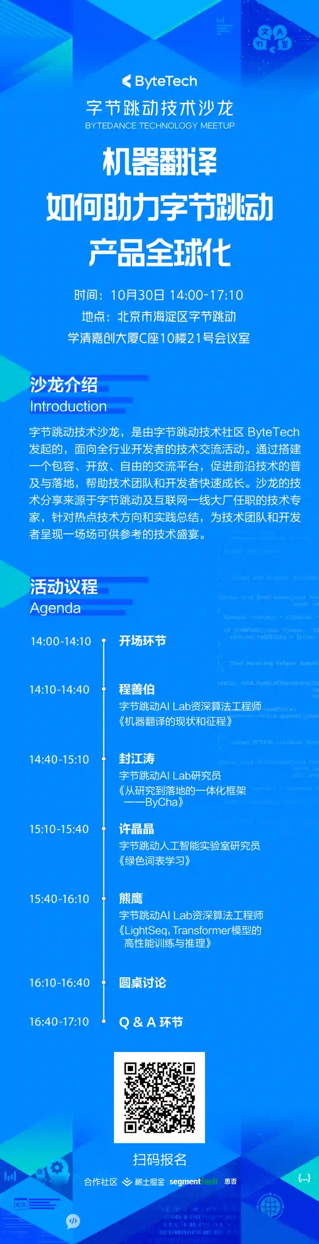 2021年10月30日,字节跳动技术社区ByteTech将主办对外技术沙龙「机器翻译如何助力字节跳动产品全球化」。邀请字节跳动机器翻译领域的技术专家许晶晶、封江涛、程善伯与熊鹰,体系化地展示字节跳动机器翻译技术的全栈能力,特别是机器翻译助力产品全球化的降本增效方案。例如,应用于火山翻译等多个内部业务的训练推理加速引擎 LightSeq、绿色机器翻译词表 VOLT,以及一体化的深度学习框架 ByCha。