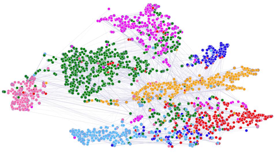 图 2. 在 Cora 数据集上对一个预训练的 GAT 模型的第一个隐藏层的计算特征表示的 t-SNE 图。节点颜色表示类别。边的粗细表示节点 i 和 j 之间的聚合归一化注意系数,由所有 8 个注意头计算得出:
