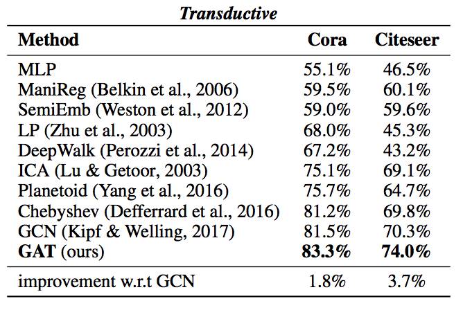 表 2:对 Cora 和 Citeseer 数据集的实验结果(分类准确度)的总结。