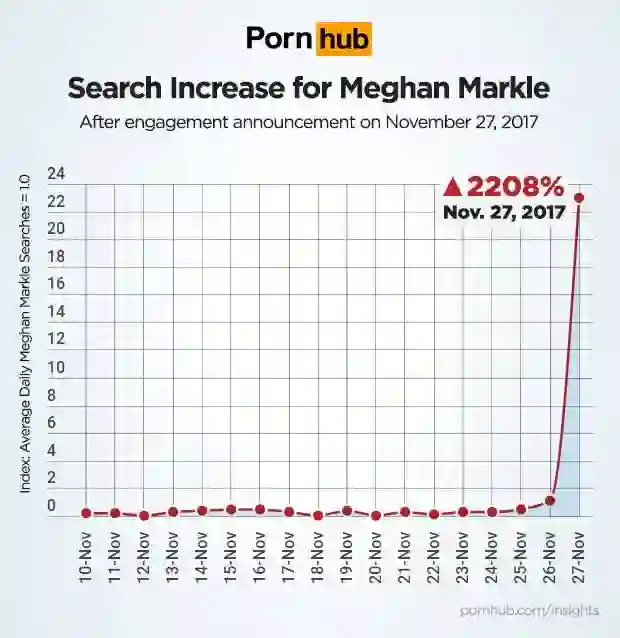 图|前阵子英国的哈里王子(Prince Harry)与美国女友 Meghan Markle 即将结婚的新闻曝光后,以 Meghan Markle 作为关键字搜寻影片的比例立刻爆冲。(图片来源:Pornhub Insights)