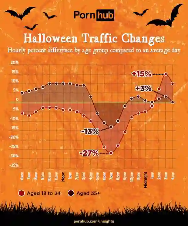 图|之前的万圣节,Pornhub Insights 也发了一份报告,发现晚上时间的流量比平日下滑,大家可能都去 Party 了,但到了深夜流量就比平日来得高。(图片来源:Pornhub Insights)