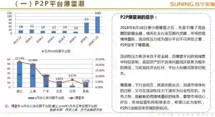 苏宁金融研究院认为,P2P 爆雷潮带来的流动性压力,更多来自于资金端,而爆雷平台的地域集中特征表明,底层资产的不良率问题或许是更为根本的原因,与宏观经济去杠杆、平台大标模式等密切相关。