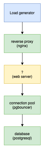 我尽可能地模拟真实世界的部署:一个反向代理,python代码(比如变量),后面再跟着一个数据库。我还加入了一个外部数据库连接池,因为我认为在Web应用程序实际部署中这种做法相当常见(至少对postgresql来说是这样的)。