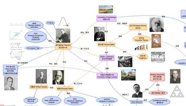 统计学的诞生,对机器学习的发展影响巨大, 大到有时候机器学习也被统计的人称为统计学习。 对于统计历史,”Lasso简史“里面有详细的说明。 这里稍微图谱一下。 妒忌表兄达尔文的高尔顿建立了实验室,后来成为伦敦大学院的统计系, 系里跑出一个老师, 创立了美国第一个统计系--伯克利大学统计系。