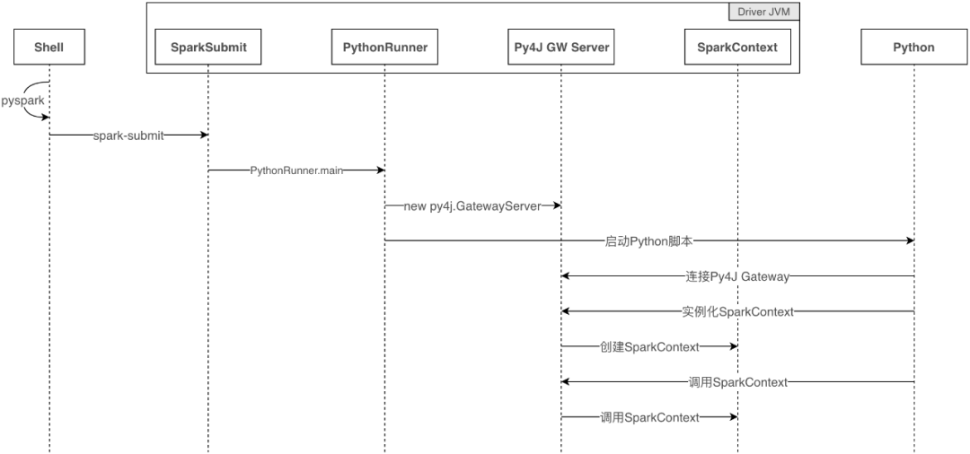 与Spark的区别是,多了一个Python进程,通过Py4J与Driver JVM进行通信。