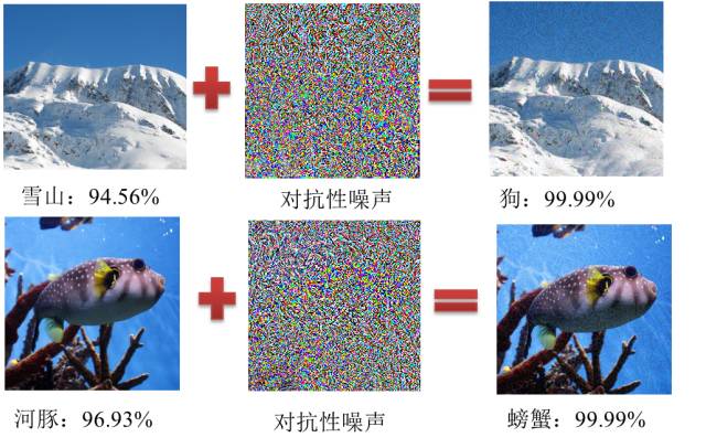 对抗样本是指攻击者通过向真实样本中添加人眼不可见的噪声,导致深度学习模型发生预测错误的样本,如下图所示:给定一张图片(雪山或河豚),攻击方给图片添加了微小的扰乱,尽管人眼很难发觉,但是模型却高概率的将其误分(狗或螃蟹)。