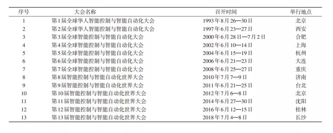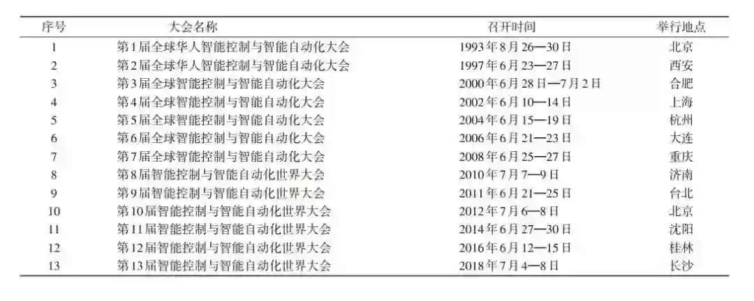 自 20世纪 90年代以来,国内对智能控制的研究进一步活跃起来,相关学术组织不断出现,学术会议经常召开。已成立了一些关于智能控制的学术团体,如中国人工智能学会智能控制与智能管理专业委员会及智能机器人专业委员会,中国自动化学会智能自动化专业委员会等。与智能控制相关的刊物,如《模式识别与人工智能》《智能系统学报》和《CAAI Transaction on Intelligence Technology》(《智能技术学报》)期刊等先后创刊。这些情况表明,智能控制作为一门独立的新学科,已在中国建立起来了。1993年由中国学者组织召开的首届“全球华人智能控制与智能自动化大会”,后修改更名为“智能控制与自动化世界大会”(World Congress on Intelligent Control and Automation,WCICA),至今已举行 13届,说明在中国已经形成智能控制学科,而且对国际智能控制的发展起到很大的促进作用。表 1简要介绍了历届智能控制与自动化世界大会的情况。