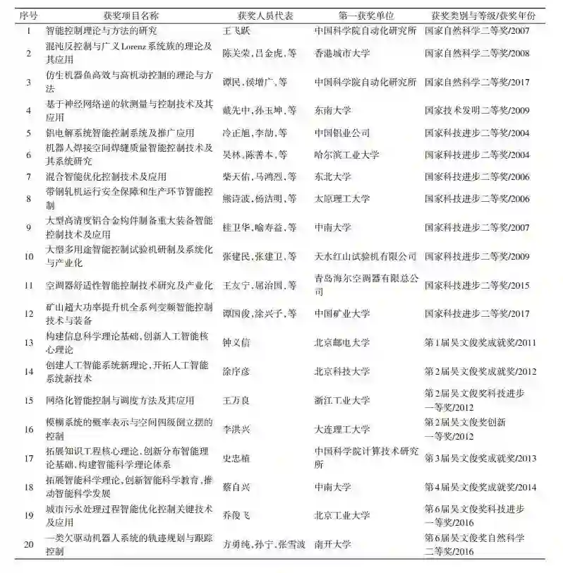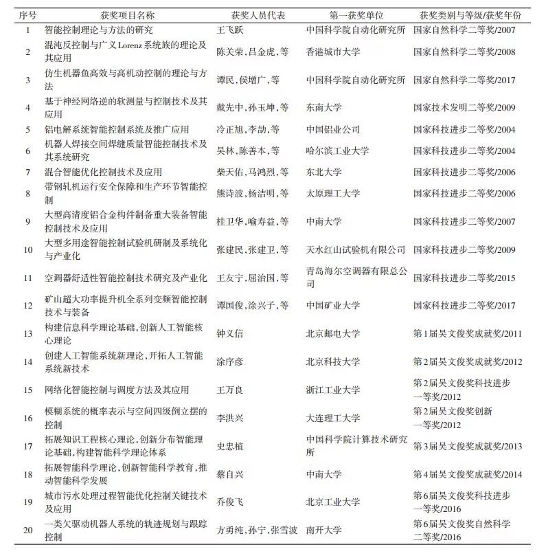 在过去 40 年,特别是近 20 年来,中国广大智能控制科技工作者对智能控制进行了多方面研究,取得不俗的科技研究成果。表 3示出了 2000—2017年国家自然科学奖、技术发明奖和科技进步奖及吴文俊人工智能科学技术奖(简称吴文俊奖)中涉及智能控制奖项的统计。
