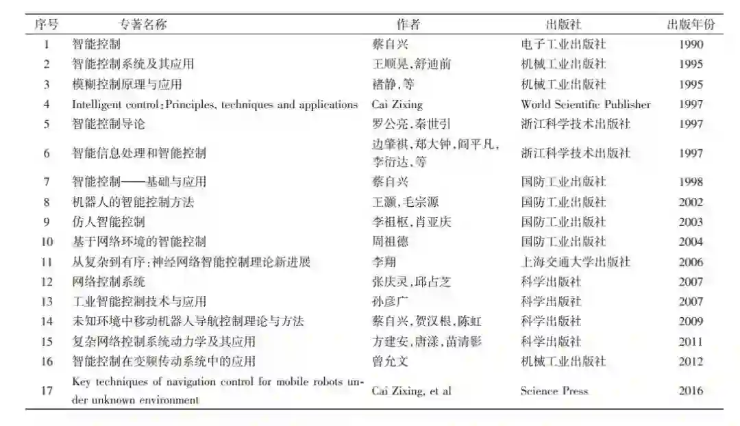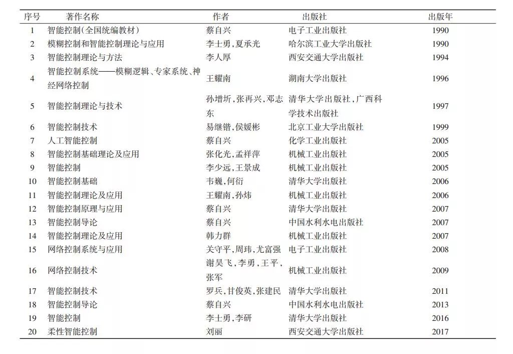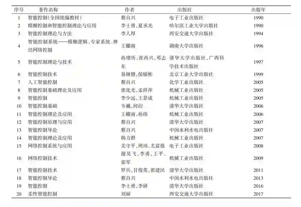 智能控制教育和人才培养是智能控制学科发展、科学研究与产业开发应用的重要基础。自 20 世纪 80年代中期开始,中国部分高校开设了智能控制课程。经过30多年的推广、提升与发展,现在中国大部分重点高校的智能科学与技术、自动化/自动控制、机械电子工程等专业都开设了智能控制类的本科生和研究生课程。有些课程的教学与教改取得有益经验,已成为国家级精品课程和国家级精品资源共享课程等。表 4给出中国已出版的主要智能控制教材情况。其中,蔡自兴所著《智能控制》是1988年由国家教育部计算机与自动控制教材编审委员会招投标、胡保生主审和评审通过,并于 1990年由电子工业出版社正式出版的全国统编教材,也是中国首部智能控制系统教材,同时是国际上首部系统全面介绍各种智能控制系统的专著。李士勇等编著的《模糊控制和智能控制理论与应用》则是中国首部智能控制研究生教材。这些智能控制课程和智能控制教材对于中国智能控制学科建设、科技知识传播和人才培养起到不可或缺的重要作用。
