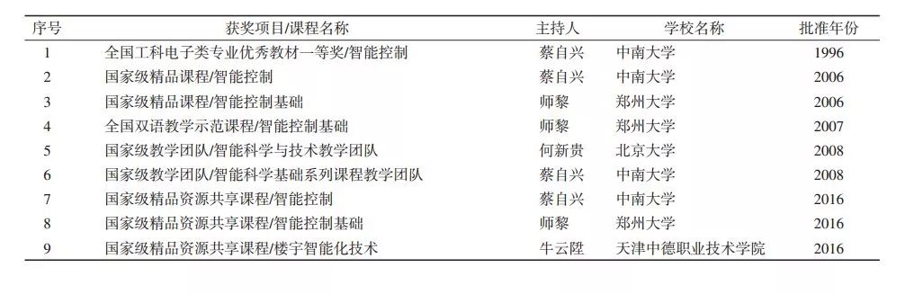 表 5示出了入选国家级质量工程的智能控制类相关精品课程名单。这些课程仅是全国质量工程国家级课程很小的一部分。例如,国家教育部 2016年 7 月15日公布第一批国家级精品资源共享课2686门,其中,本科教育课程1767门,高职教育课程 759门,网络教育课程 160门。而智能控制类课程虽然榜上有名,但只有 3门,约占 0.1%。不过,这些智能控制类课程来之不易,已在改革中不断发展壮大,并对全国智能控制教学发挥了重要的示范与辐射作用。