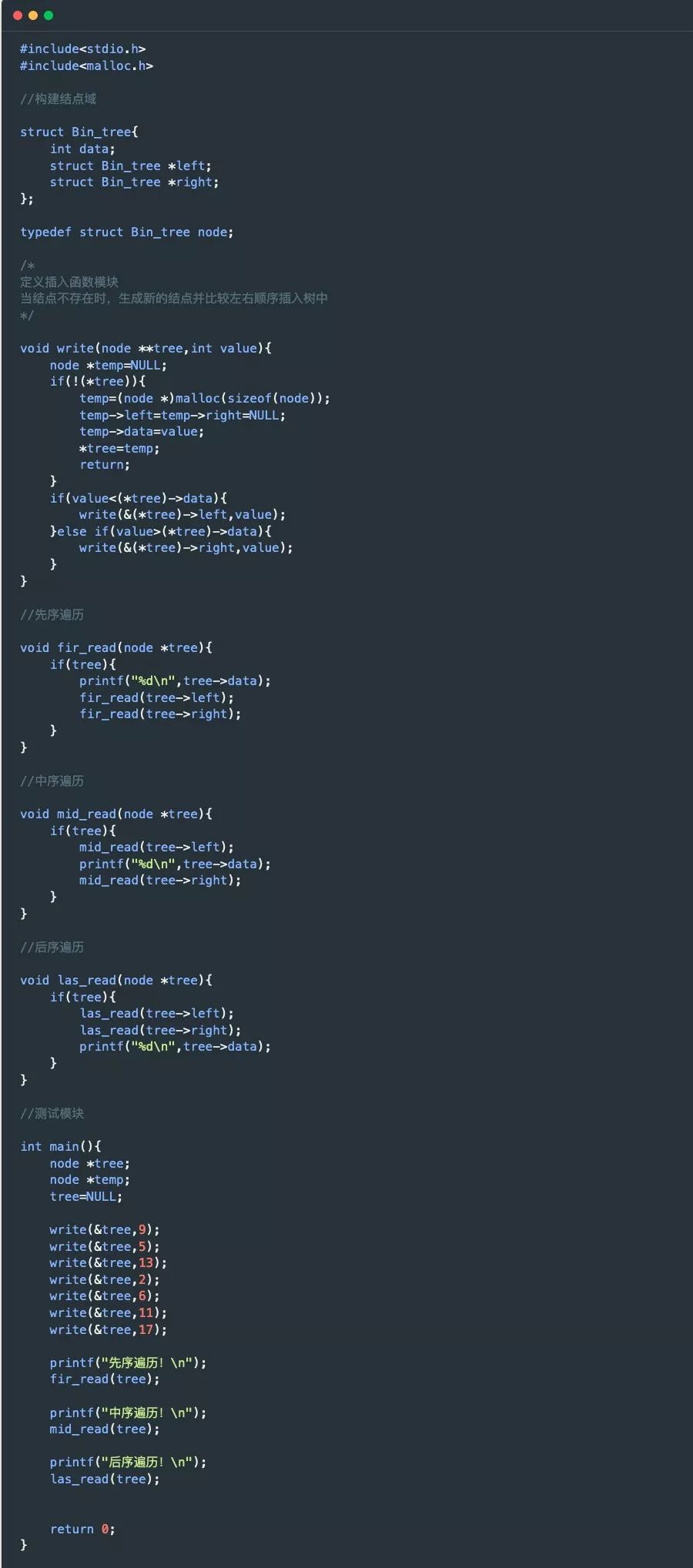 还有一种遍历法,称为层序遍历,有兴趣的读者可以尝试着写一下。