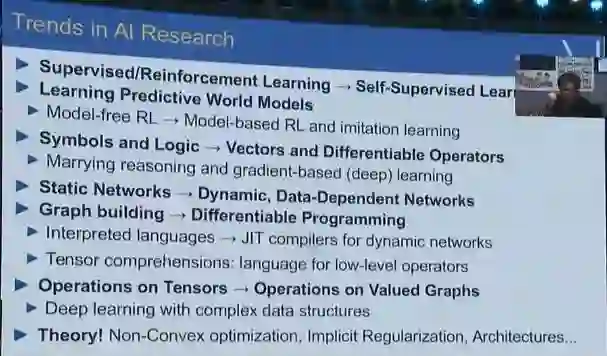 最后我做一下总结。对于 AI 学术研究的趋势,监督学习和强化学习即便不会被取代,也会被自我监督学习和无监督学习明显地增强;学习具有预测能力的模型也会成为未来几年内的研究热点,这能让我们从无模型的强化学习来到基于模型的强化学习以及模仿学习,它们的效率都会提升很多,所需的尝试次数也会少很多。