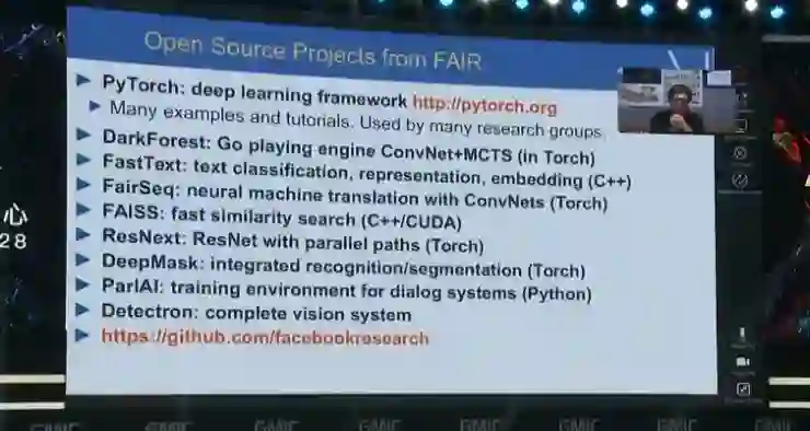我觉得对于行业来说,进行这样的开发研究将是会是一个非常有用的过程,对于我们研究团队来说,不仅仅要开发对我们公司来说非常有用的技术,同时我们也希望所开发的技术能够引导整个社区,能够解决我们所感兴趣的问题。我们认为 AI 不仅仅会帮助 Facebook 解决问题,同时还会帮助人类解决很多自己无法解决的挑战,所以我们会与我们的科学团队一起朝这方面努力。以下是在过去的几年里, 所发布的一些开源项目,包括像深度学习网络、深度学习框架,还有关于深度学习的应用。