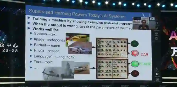 我们看一下今天的 AI 系统,如今所有的应用,不管是影像、声音或者是图像的识别,或者语言间的翻译等,这些内容 AI 都需要通过监督学习来获得。比如说向它展示一些车的图像,告诉它这些都是车,下次再向机器展示车的图像的话,它就会告诉你答案是车。所以你可以看到,监督学习,对于计算机的学习非常重要。