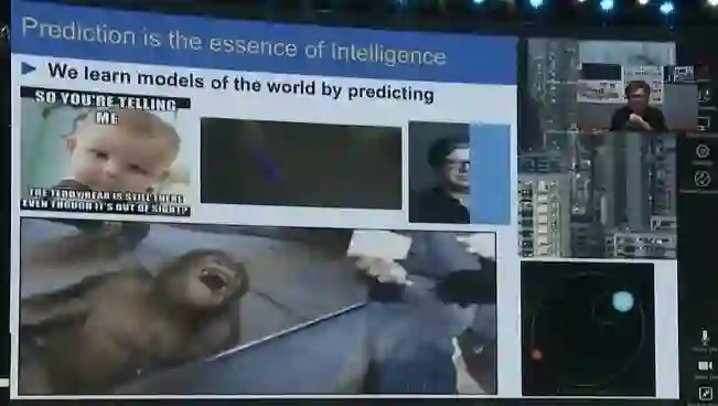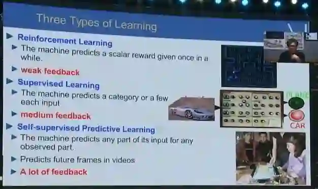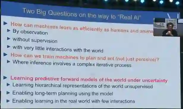 那么我们需要做的,也就是让机器具备对这个世界的模型,我把这个称作「自我监督学习」或者「预测学习」。机器要尝试预测自己看到的东西的各个方面,这也可能就是能让机器像人类一样高效地学习的关键。