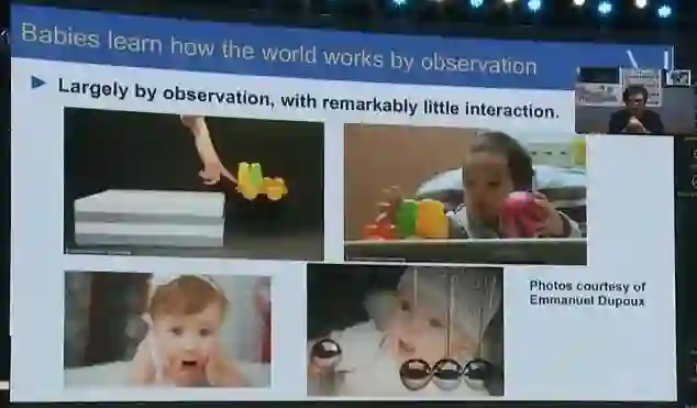 我们想想婴儿是怎么学习的呢?比如我们给婴儿看左上角的这张图,那个小车漂浮在空中,虽然没有下面没有任何支撑,但是并没有掉下来。不到 6 个月大的婴儿看到这张图片并不会觉得惊讶,但是更大的婴儿已经知道了没有东西支撑的话是会掉下来的,看到这张图片就会很惊讶,像左下角的图这样。我的一位朋友,她是在巴黎工作,她给我们展示了婴儿在每个月分别能学会哪些概念,而且他们也能够了解到一些物理最基本的原理。这是他们在生命的最初几个月学到的一些概念,也就有假说认为这就是「常识」萌芽的时期。