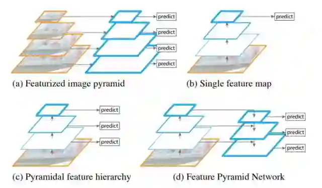 FPN 网络结构如下图d(其中YOLO使用b结构,SSD使用c结构)所示,它的结构具有相当的灵活性,可以和各种特征提取网络结合作为检测算法的基础网络。在后文中会看到,目前大多数state-of-art的模型都采用了这种结构。其中RetinaNet在FPN的基础上使用了ResNet网络提取特征,并用Focal Loss损失改善单步目标检测算法中普遍存在的前景类和背景类损失不均衡的问题。这些基于FPN结构的检测算法能够在增加网络深度、获取更丰富语义信息的同时从浅层特征图中获取更丰富且高分辨率的图像特征,这使得这种网络结构在实际应用中表现出优异的性能。
