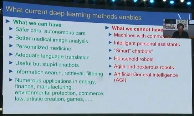 刚才看到的都是一些已经做到的深度学习成就,那么我们还需要看一下,距离达成「真正的 AI」我们还缺了什么。现在我们已经可以构建出更安全的车辆或者说自动驾驶车辆,我们有更好的医学影像分析、还不错翻译软件、差不多能用的聊天机器人,但我们还做不出来有「常识」的机器人、做不出真正有智慧的个人助理、做不出可以替代洗碗机的管家机器人。我们缺了一些重要的东西。