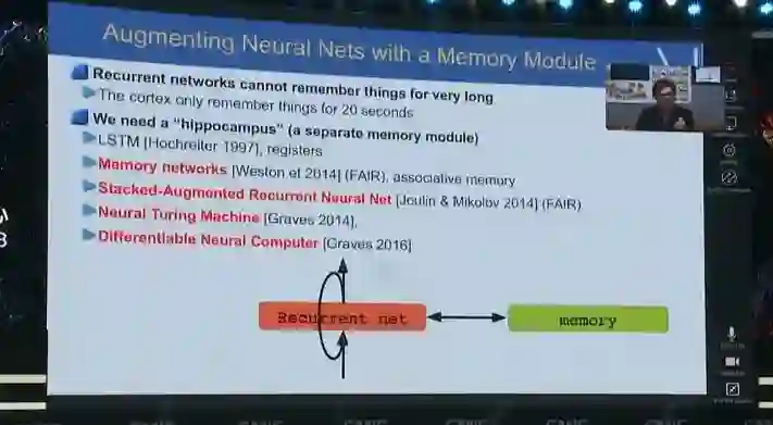 这是几年前所开展的一项典型的工作,Facebook 和纽约大学一起合作的,用记忆模块增强神经网络,网络的结构也就是动态的。这样的做法也会影响未来我们用什么样的工具开发神经网络。