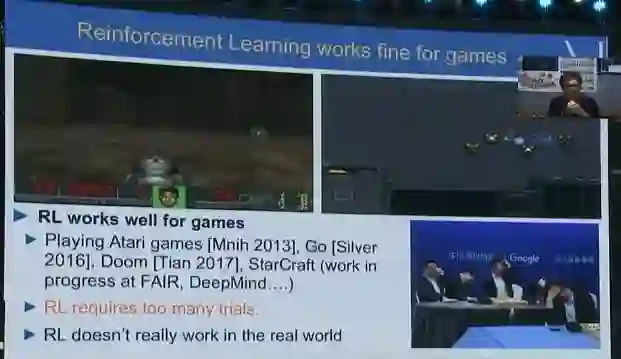 玩 DOOM、下围棋,都没有问题,但是因为强化学习需要很多的尝试,AlphaGo 甚至自我对局了上百万局,这些都是现实世界里做不到的。所以强化学习并不适合解决现实生活中的问题。玩 Atari 游戏需要上百个小时才能玩到人类玩几分钟的水平,学开车就更是要先撞坏很多车才能学会;现实世界里的尝试也没办法加速时间。这都是不可接受的。