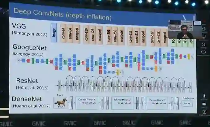 大家可以看到几种常见的神经网络,比如 VGG、GoogLeNet、ResNet 还有 DenseNet 等,比如说有 100 层或者 180 层的一些人工神经网络。像在 Facebook 中我们会广泛使用深度神经网络来识别图像。
