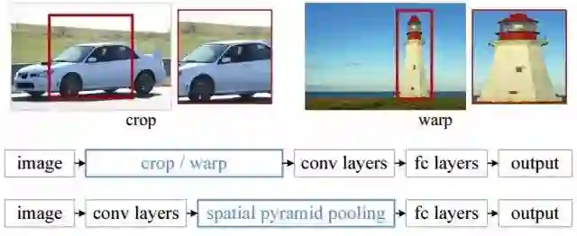 R-CNN的卷积网络只能接受固定大小的输入图像。为了适应这个图像尺寸,要么截取这个尺寸的图像区域,这将导致图像未覆盖整个目标;要么对图像进行缩放,这会产生扭曲。在卷积神经网络中,卷积层并不要求输入图像的尺寸固定,只有第一个全连接层需要固定尺寸的输入,因为它和前一层之间的权重矩阵是固定大小的,其他的全连接层也不要求图像的尺寸固定。如果在最后一个卷积层和第一个全连接层之间做一些处理,将不同大小的图像变为固定大小的全连接层输入就可以解决问题。