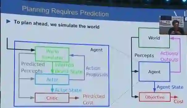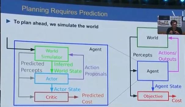 我总结一下,这也就是我们近期在 Facebook 做的预测学习,学习如何预测、推理以及计划,也就是学习「常识」。它的核心思想是,自动的智能机器人应当有一个内部的世界模型,可以在它做出行动之前自己进行模拟,预知自己的动作的结果。这是一种最优控制中常见的方法,但在机器学习中就不那么常见了。这里我们遇到的问题也就是如何让人工智能学会对世界建模、从而用这个模型帮助自己规划现实世界中的行为。