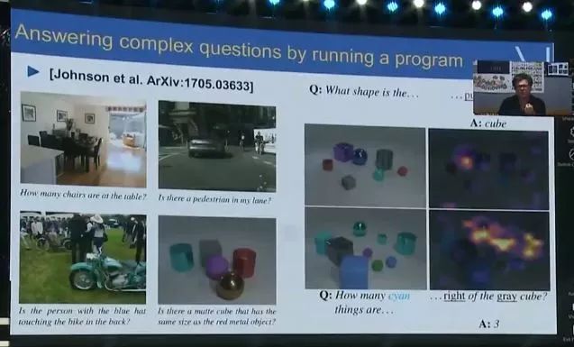 这是另外一个关于动态计算的例子。如果你要建立一个系统能够回答复杂问题的话,比如下面的这副图中,红色的立方体,是不是要比别的大一些?或者立方体有没有比某个颜色的东西更多?这是几年前 Facebook 和斯坦福大学合作的研究,它的关键思想是,通过循环神经网络 LSTM 输入问题,问题会被编码成向量的形式,然后向量再被另一个网络解码,解码后的结果像是一种程序,程序解释后的结果是几个模块连接形成的计算图。这样最终我们就解答了这个问题。