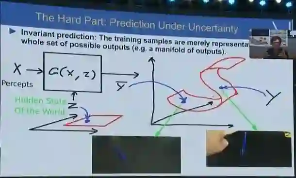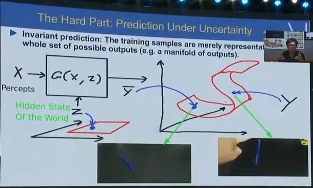 预测的时候还需要处理不确定性,在桌子上立一支笔,然后松手,它就会倒下来。我们只确定它会倒下来,但是不确定具体会倒向哪个方向。这种时候我们也就需要对抗性训练,训练模型不只给出一个答案,而是多个可能的答案。这里需要两个模型,一个模型做预测,另一个模型来评判哪些结果还不错、哪些结果是现实世界不太可能发生的。做预测的模型也就要尝试让自己的预测越来越好,让做评判的模型分不清哪些是真的会发生的,哪些只是预测出的结果。