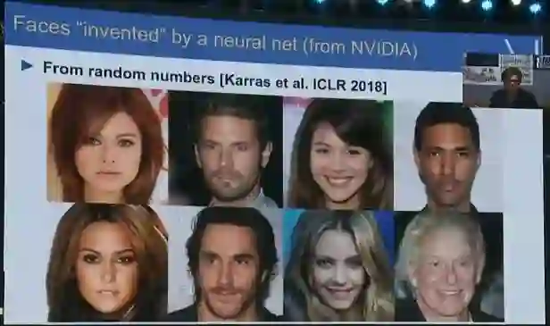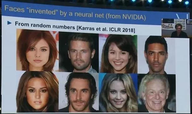 根据这样的思路,早几年的 GANs 就可以生成卧室的照片。今年 NVIDIA 也可以生成非常逼真的高清明星照片。这个结果非常有趣,下周开幕的 ICLR 会议上就会介绍这篇论文。