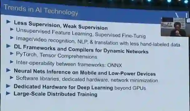 在 AI 的技术应用方面,我认为监督学习会变少,更多的会是无监督特征学习、监督微调,这样可以在更多没有充足数据的场景下工作,比如小语种的翻译,只有很少的双语对照语料。我们也会看到新的深度学习框架出现,为动态网络提供编译器,PyTorch 就在尝试向这个方向发展;对于不同框架之间的可协作性,我们也和微软、亚马逊等公司一起合作设计了 ONNX。让神经网络在移动、低功耗设备上做推理也有很多研究,这已经成为了一个非常重要的问题,对于 Facebook 这样的公司来说,每天用户要上传 20 亿张照片,而且每张照片都需要被一系列卷积网络识别,分析不同的信息。这会消耗很多电力,尤其是想要拓展到处理视频等一些别的任务中的话。所以也就需要研究如何在低功耗设备上运行神经网络。现在手机上也已经出现了 GPU 之外的专用深度学习处理器。