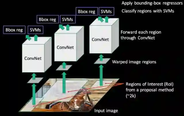 R-CNN不采用滑动窗口方案的原因一是计算成本高,会产生大量的待分类窗口;另外不同类型目标的矩形框有不同的宽高比,无法使用统一尺寸的窗口对图像进行扫描。用于提取特征的卷积网络有5个卷积层和2个全连接层,其输入是固定大小的RGB图像,输出为4096维特征向量。对候选区域的分类采用线性支持向量机,对每一张待检测图像计算所有候选区域的特征向量,送入支持向量机中进行分类;同时送入全连接网络进行坐标位置回归。