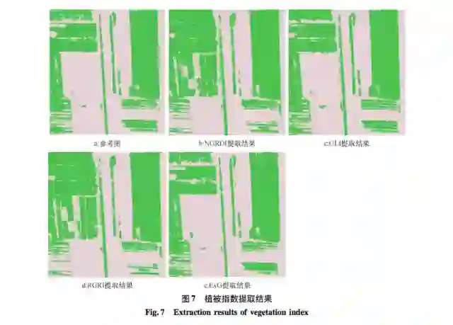 从表 3 和图 7 可以看出,GLI 与 ExG 的提取效果最好,细节部分都能很好地提取,总体精度均大于 97%,与参考图像最接近。
