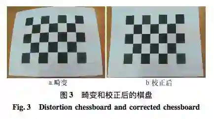 本试验中采用固定棋盘纸而移动相机的方式拍摄,共获得不同角度与深度的棋盘格图像 24 张,并编程求取相机的内部矩阵。畸变棋盘格与校正后的棋盘格的试验图像见图 3。由获得的畸变矩阵校正后的影像见图 4,为保证校正后图像与原图大小一致,采用 1 次插值,并编程调整图像大小。