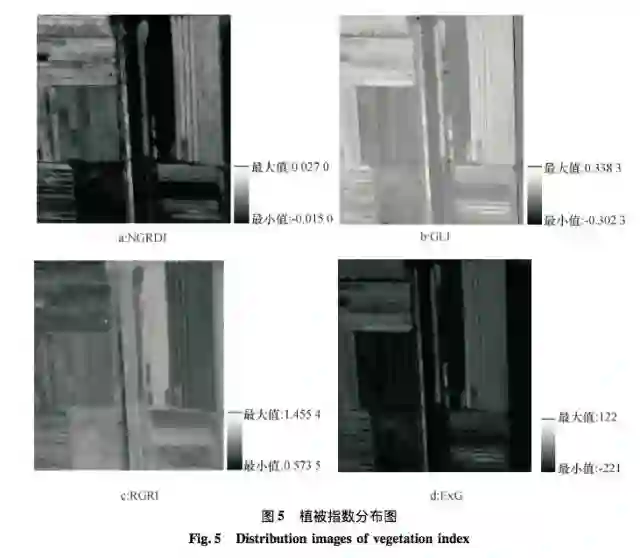 (注:以上 4 个植被指数分布图中,RGRI 指数分布图的色调越暗,表示植被指数值越高;而 NGRDI、GLI 与 ExG 指数分布图的色调越亮,表示植 被的指数值越高。)