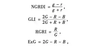 基于可见光的植被指数主要有归一化绿红差异指数( Normalized green-red difference index,NGRDI )、绿叶指数( Green leaf index,GLI )、红绿比值指数( Red green ratio index,RGRI ) 、过绿指数( Excess green,ExG )等。