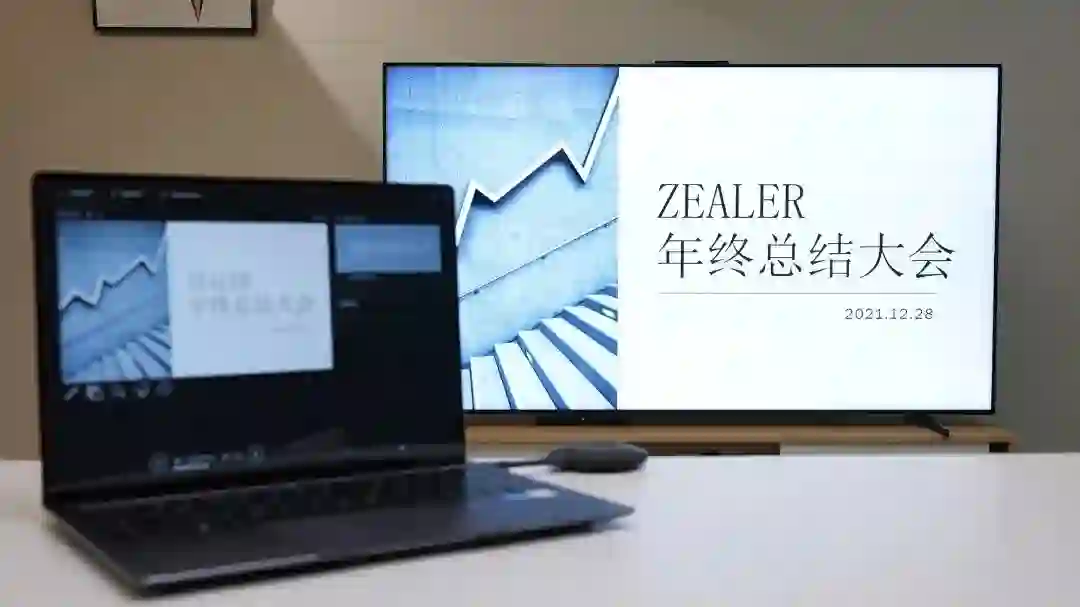 小米投屏器内置了信号转换芯片,可以进行解码投屏,最高支持 4K30 帧的信号输入。使用笔记本和 4K 电视进行连接,在笔记本中选择拓展模式下,电视可以实现 4K 满屏输出,还能利用 PPT 演讲者模式,作为输出端的笔记本还可以显示需要讲解的会议重点。