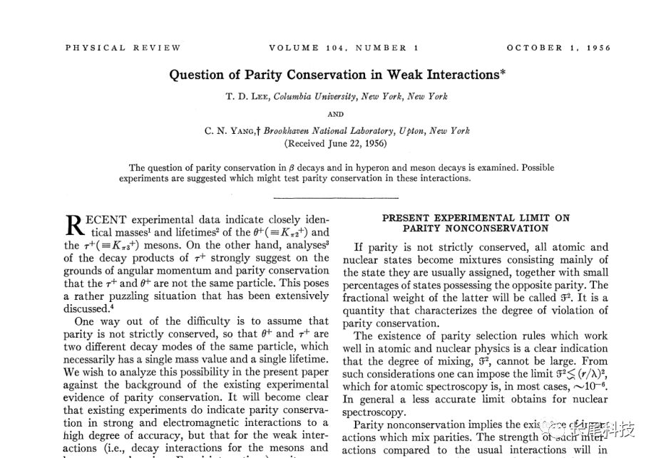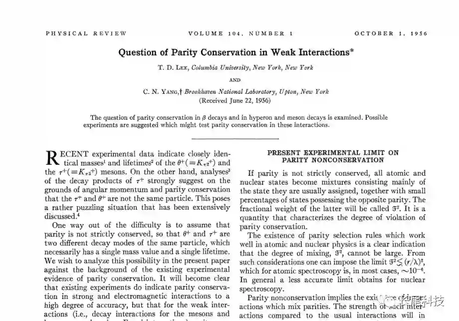 上图便是这篇经典论文的截图,论文我已经给大家找到了。想要亲眼目睹杨振宁、李政道这两位物理学大师的这篇论文的,可以在我的公众号(长尾科技)里回复“宇称不守恒论文”获取论文的中文版和英文版。