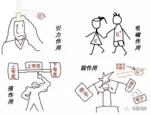 我们在自然界发现的所有作用力最终都可以归结为这四种:引力、电磁力、强力、弱力。引力和电磁力我们很熟悉,强力和弱力都发生在原子核里面,我们平常接触不到。强力简单的说就是粘着质子、中子、夸克不让原子核分崩离析的那种力(不然的话,质子都带正电,它们之间同性电荷产生的排斥力早就把原子核给拆了),弱力是造成放射性原子核衰变的那种力,就是中子变成质子,质子变成中子那个过程中的力。