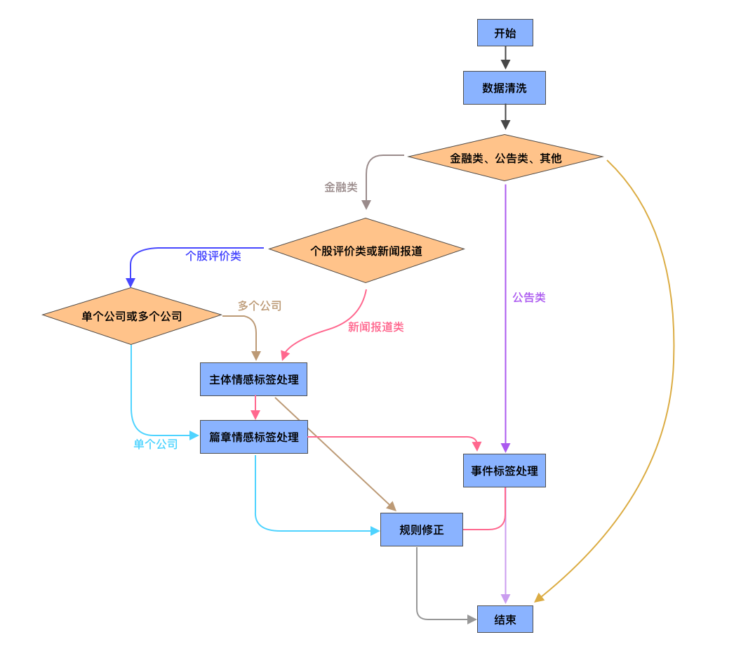 如图 2 所示,整个系统的算法结构从数据清洗开始,需要去除一些特殊符号并规范格式。清洗过后,首先要对文本进行金融非金融的分类,不是金融类别的文本会被过滤掉。留下的金融文本需要再次进行分类,以区分公告非公告。其中公告文本可以直接走公告事件体系,直接给出对应的金融逻辑情感标签。而非公告类文本,即常规的金融新闻,会进入主体和篇章情感模型中进行分类。最后,基于长期积累形成的一个针对宏观、行业、个股的投资事件体系,如果检测触发了其中的一些重要事件,则会根据这些重要事件的金融逻辑情感标签对模型结果进行修正。