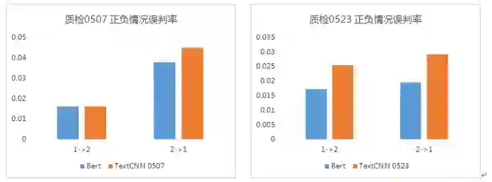 以主体情感分类为例,我们主要关注模型的正负误判率,对于此项指标,如图 3 所示,在两次质检数据上,BERT 的表现均更优。