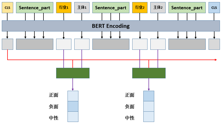 进一步的,针对上文提及的主体情感的易错数据类别,我们对模型进行了特别设计,以适应数据集自身特点。例如,对于高占比的多主体问题,如果只是单纯利用 BERT 进行情感分类,则不能有效学习同一句话中不同实体之间的情感差别。为此,设计模型如图 4 所示: