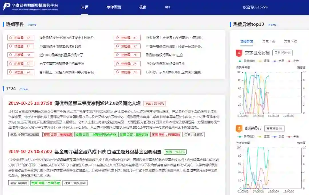 华泰证券是一家致力于利用科技助力金融业务的行业头部券商。我们基于全网金融网站的实时新闻数据,借助 TensorFlow 和 BERT 模型,训练并部署了一套舆情分析系统(如图 1 所示)。系统实时追踪热点话题,解析新闻关联的公司、行业和事件,给出情绪标签和异动榜单,同时还可以针对特定事件,进行回测,挖掘事件与标的涨跌的相关性。系统在交易、资管、投研、风控等多个业务场景均已落地并发挥重要作用。