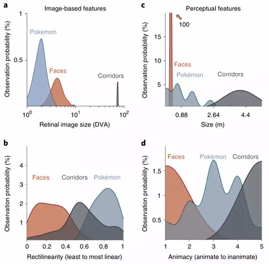 研究人员同样分析了受试者观测Pokémon的四种要素,并与观测人脸和场景的反应进行了对比。结果显示,人类在观测Pokémon时,视野更向视网膜中央集中,范围比人脸还小;更趋于直线感知;物体极小;对生命特征的判断介于人脸与场景之间。Pokémon这些特殊的条件会向VTC异于负责人脸和场景的脑区输送信息,最终形成了“Pokémon脑区”。