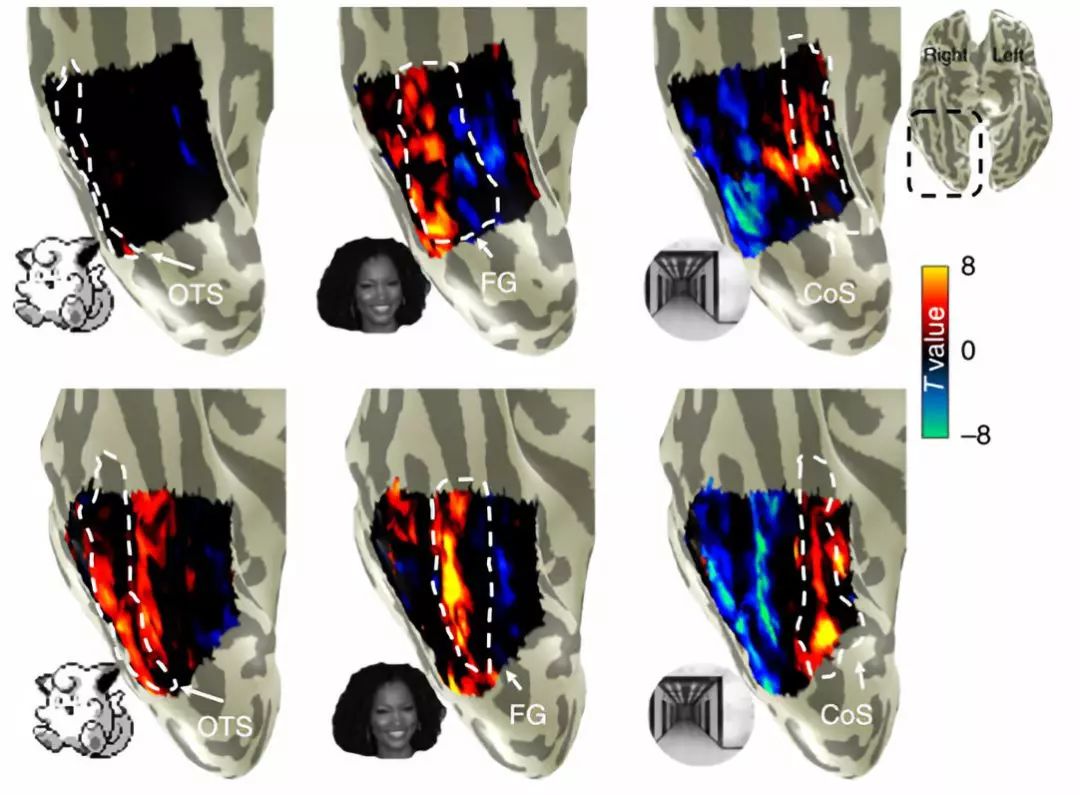 对于两组受试者来说,他们在观察人脸和场景地点时,脑区的反应几乎是一样的。尽管每个人的大脑解剖学上会有一定差异,但是在VTC脑区所有人都有固定的位置负责识别人脸和场景。然而Pokémon就明显出现了差异,小时候的Pokémon游戏高手,他们在观察平面的Pokémon角色时,VTC的脑区某些区域会产生剧烈反应,并且发生反应的区域与识别人脸和场景地点的都不一样。而对照组的人就对Pokémon完全没有特殊反应。