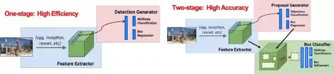一步法检测器在原图上铺设一系列锚点框,利用一个全卷积网络,对这些锚点框进行一次分类和一次回归,得到检测结果。而二步法检测器在原图上铺设一系列锚点框,先利用一个全卷积网络对这些锚点框进行第一次分类和第一次回归,得到候选区域,抠出每一个候选区域的特征后,再利用一个网络对候选区域进行第二次分类和第二次回归,得到最终的检测结果。