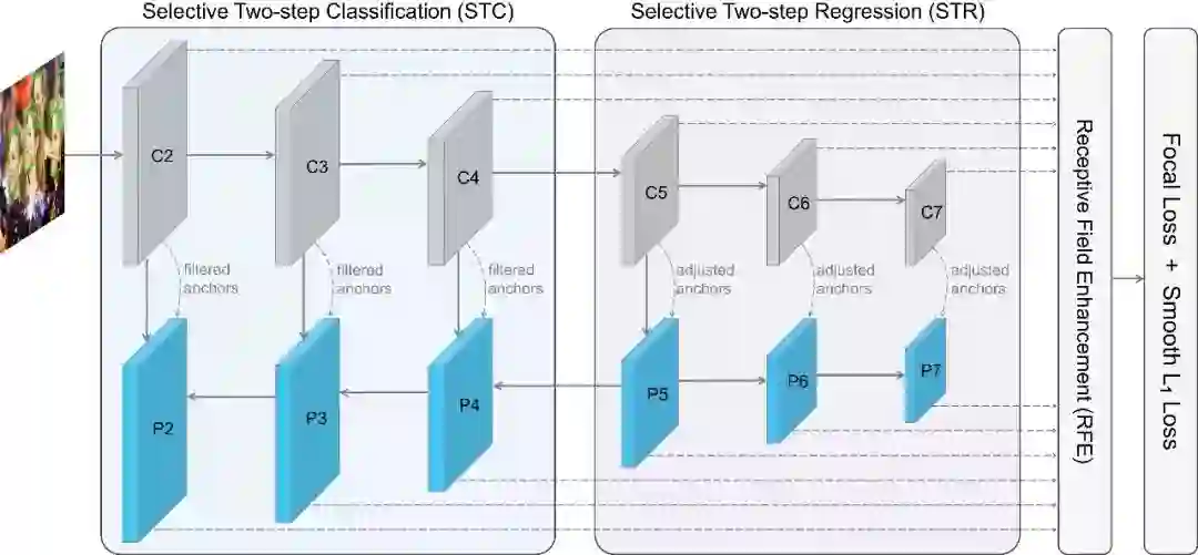 RefineDet在处理人脸检测这一特殊任务时,并不是在所有的检测层上做二阶段分类和二阶段回归都有提升。二阶段分类用于较浅的3个检测层上有效果,原因是98.5%的锚点框关联于较浅的3个层,这些层存在正负样本不平衡的问题,二阶段分类得以发挥作用。此外,二阶段回归用于较深的3个检测层上有效果,原因是强行让较浅层利用二阶段回归去得到更准的小人脸位置,会影响更重要的分类任务,而较深的3个层则不存在这种问题,适合做二阶段回归来提升大中尺度的人脸位置。