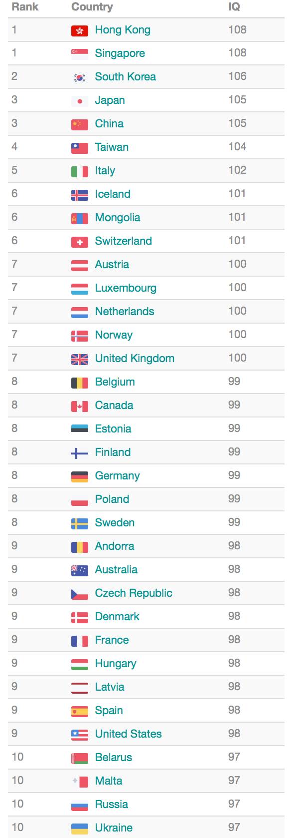 这是在调查中排名前 10 位的国家和地区,其中有不少名词是并列的。我们可以看到,中国香港和新加坡的国家平均 IQ 最高,达到 108。中国的国家平均 IQ 是 105,和日本并列第三。排在第二的是韩国(106)。美国的国家平均 IQ 是98,排在第9。