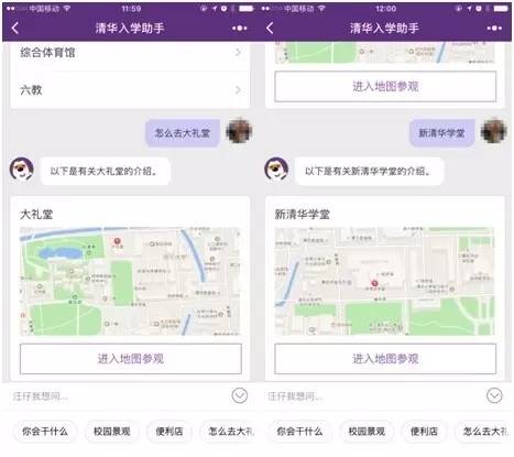 搜狗搜索联合清华大学共同研发出一款AI对话式智能自助应用“清华入学助手”,依托搜狗搜索的智能问答技术,以搜狗汪仔的形象作为客服角色,以人机智能对话回答提问作为主要服务方式,面向校园应用场景,为入学新生提供公寓服务指南、校内地点查询和校史讲解等咨询服务,帮助入学新生快速熟悉校园生活。